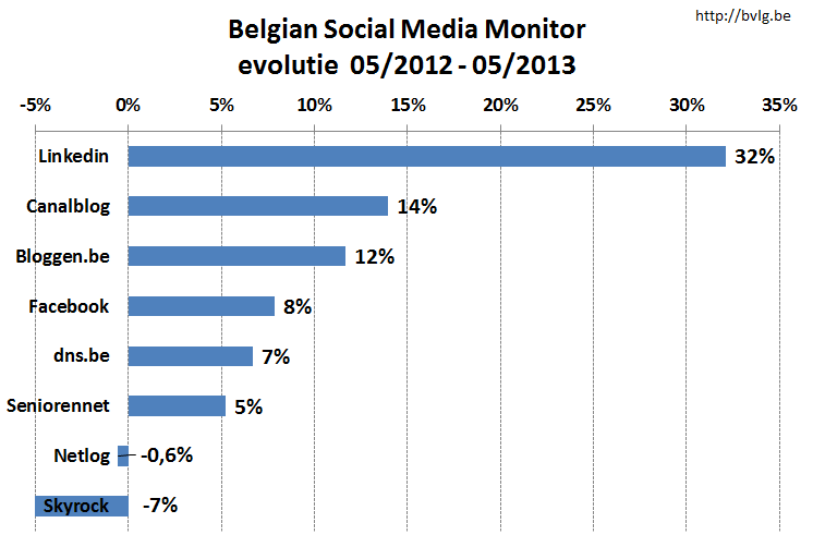 Sinds het najaar van 2011 lijkt de groei van Facebook in België wat af te nemen. Het zakelijke sociale netwerk LinkedIn blijkt veel sneller uit te dijen: het platform groeide op een jaar tijd met 32 procent tot 1.533.539 profielen. In onderstaande grafiek (klik voor een vergroting) kan je de groei van de diverse in ons land actieve socials networks waarnemen. Daarin zijn ook enkele blogplatformen opgenomen, evenals de registratie van .be-domeinnamen (dns.be). Het plaatje maakt tevens duidelijk dat de rol van Netlog en Skyrock, 's lands grootste profielensites vóór het Facebook-tijdperk, definitief is uitgespeeld. Twitter en Google Plus ontbreken in het overzicht. Hier zijn geen Belgische cijfers van beschikbaar.